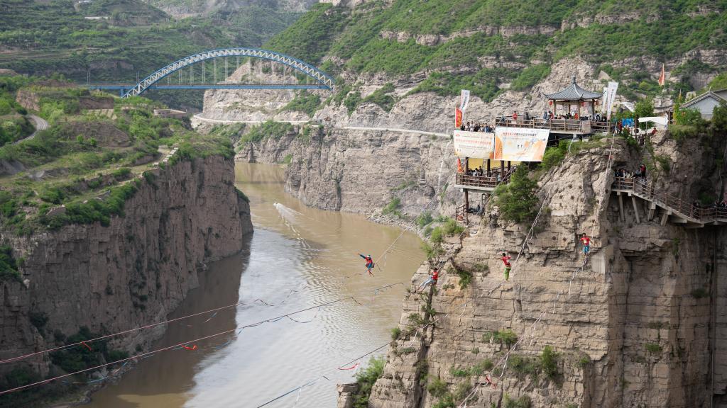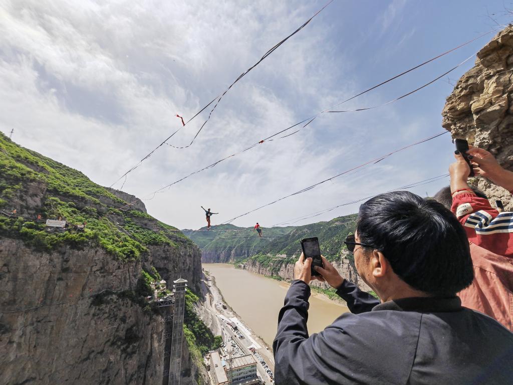 国际高空扁带挑战赛在山西省河津市的黄河大梯子崖景区开赛。兰立强 摄