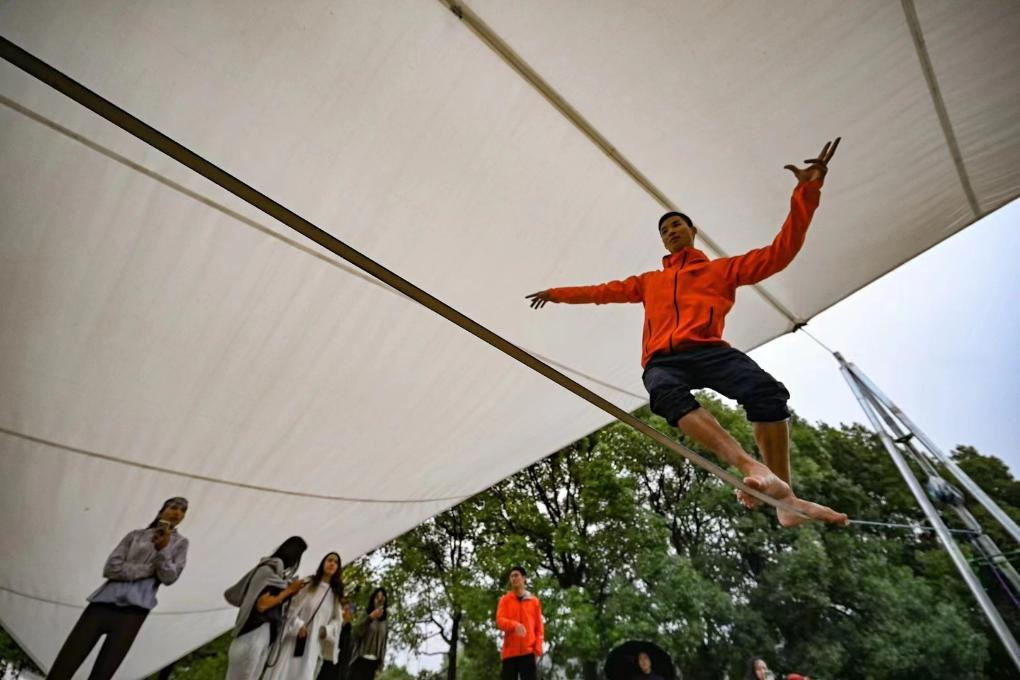 参赛者在离地175米的扁带上