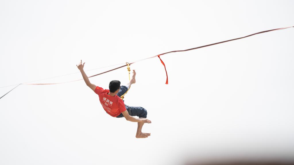 选手从扁带跌落时有安全绳保护。兰立强 摄