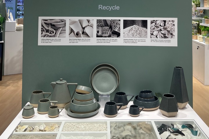 广东潮州市庆发陶瓷有限公司将牡蛎壳、碎瓷片回收重新加工,“变废为宝”制成精美工艺品;浙江爱仕达股份有限公司推出可拆卸手柄锅,在运输过程中,手柄可卸下置入锅内,减小产品体积、节省运费和包装材料;广东恒创陶瓷有限公司带来升级版陶瓷制品,经工艺改良,同款杯型比原先用料减少30%……