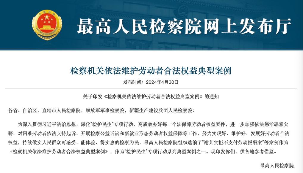 此次发布的典型案例共8件,包括“谢某实拒不支付劳动报酬案”“吉林省桦甸市人民检察院督促保护农村劳动者权益行政公益诉讼案”等,内容涵盖依法惩治恶意欠薪、对困难劳动者依法支持起诉、开展检察公益诉讼等。