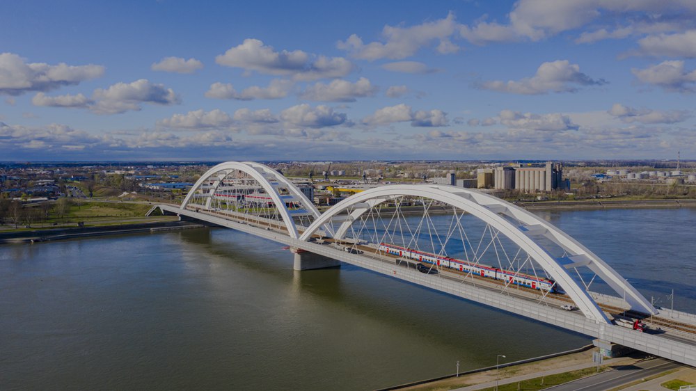 2024年3月12日,一列火车运行在匈塞铁路塞尔维亚境内贝诺段诺维萨德多瑙河大桥上(无人机照片)。新华社发(任卫云摄)