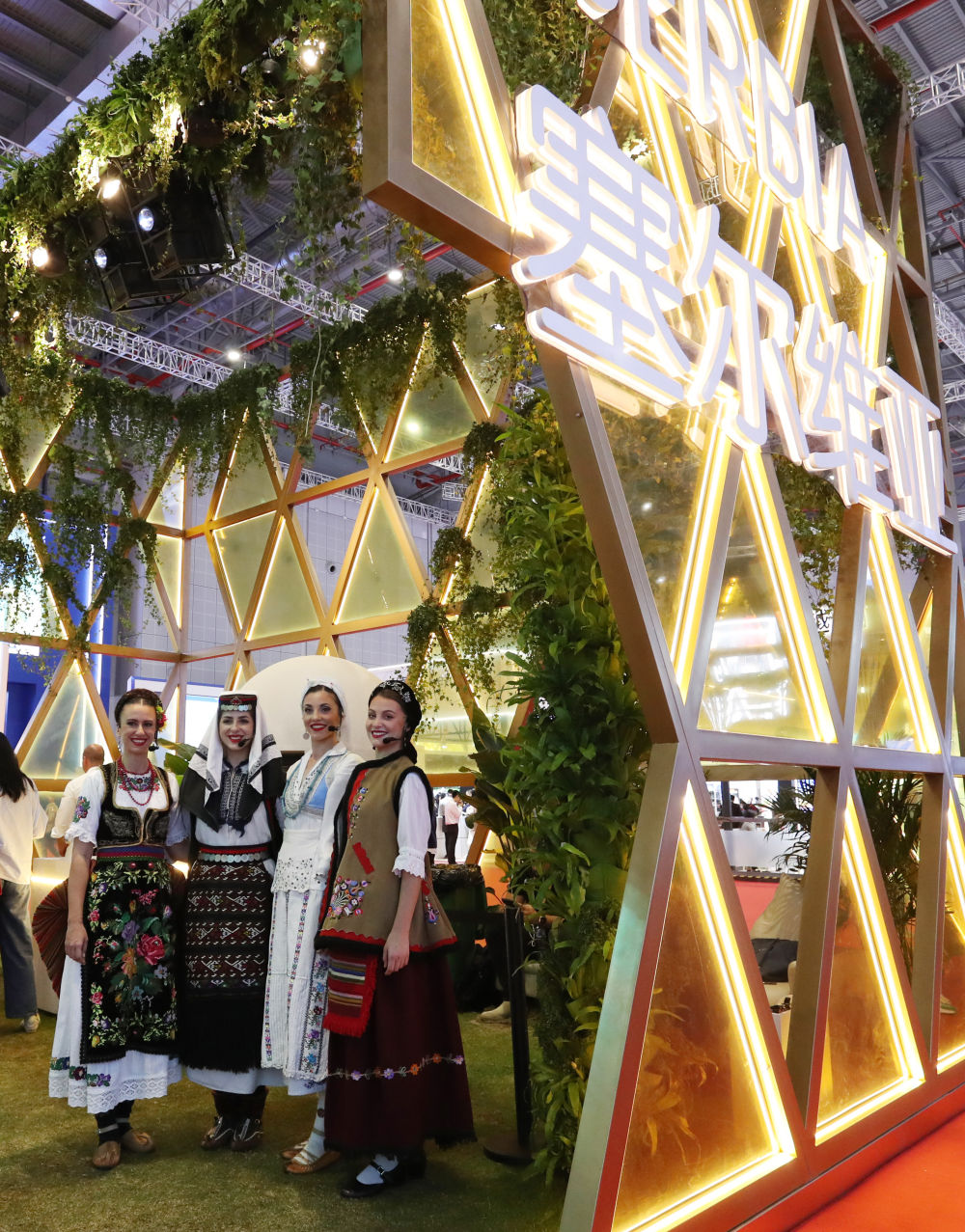 2023年11月6日,身着传统服饰的演职人员在上海进博会国家展塞尔维亚展台迎接参观者。第六届进博会国家展全面恢复线下举办,洪都拉斯、塞尔维亚、越南、南非、哈萨克斯坦作为本届进博会主宾国在国家展亮相。新华社记者 方喆 摄