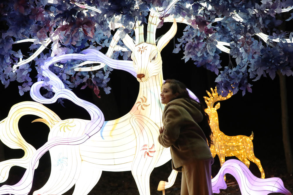 2023年12月14日,一名女子在法国巴黎风情园举办的“山海有灵”法国豫园灯会上拍照留念。新华社记者 高静 摄