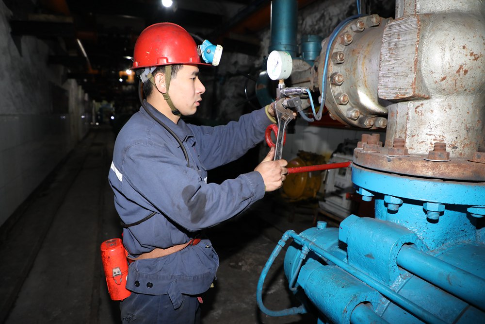 2024年4月30日,冀中能源峰峰集团新屯矿机电区副区长顾博在井下泵房检修水泵。新华社发