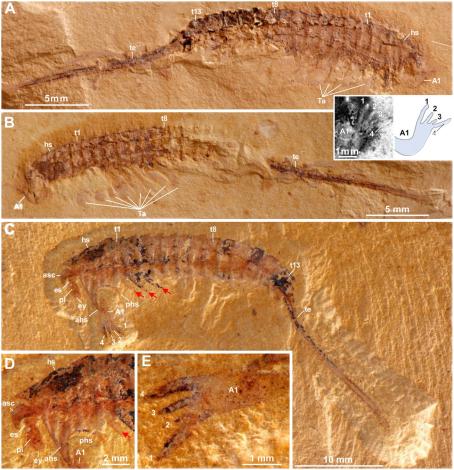 团队负责人、云南大学古生物研究院副院长刘煜研究员介绍,距今约5.2亿年前的早寒武纪节肢动物中有一个特殊分支,它们的第一对附肢不是蜈蚣等节肢动物头部常见的触角,而是一对用于捕食的、强壮的大附肢。因此它们也被称为大附肢节肢动物,长尾螳螂虫正是大附肢节肢动物的一种。