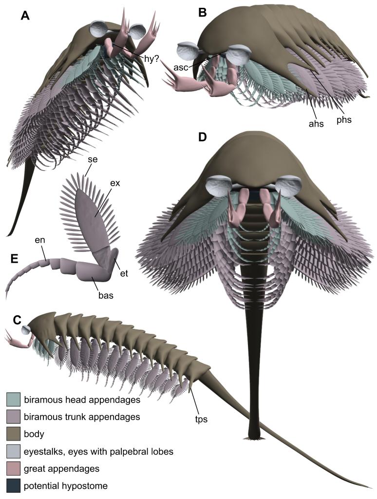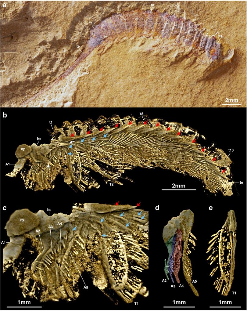 CT三维模型清晰地显示了长尾螳螂虫细长的躯干由13个体节组成,尾部呈长棒形,末梢有细刺。值得一提的是,其头部有6个分节,即附着有一对柄状复眼的前骨片、有着一对大附肢的体节,以及4个各具一对双支型附肢的体节。研究显示,长尾螳螂虫的双支型附肢由向远端逐渐变细的内肢和边缘具有刚毛的片状外肢组成,其基节根部附着一个小的外叶。