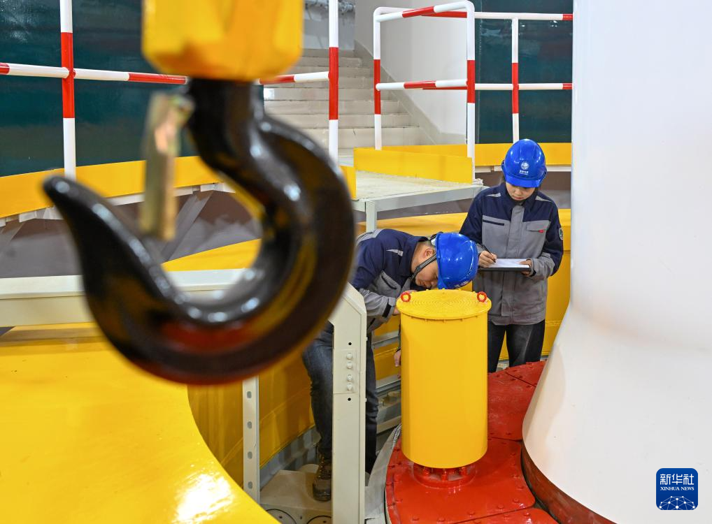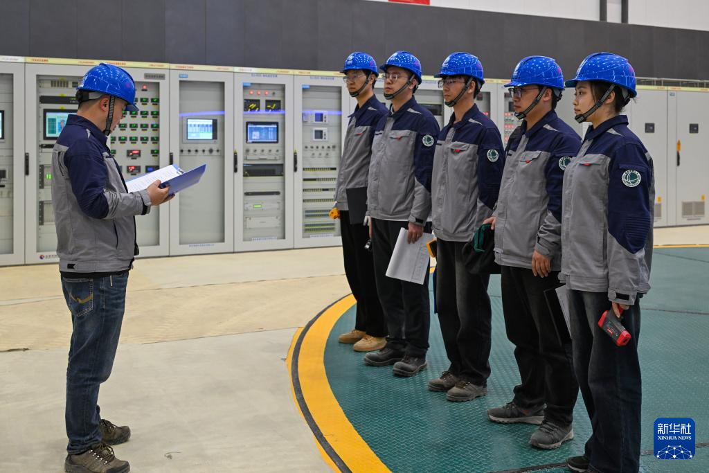 4月23日晚,工作人员在国网新源新疆阜康抽水蓄能电站地下厂房对3号机组进行调试。新华社记者 陈朔 摄