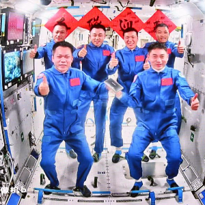 2024年4月26日5时04分,在轨执行任务的神舟十七号航天员乘组顺利打开“家门”,欢迎远道而来的神舟十八号航天员乘组入驻“天宫”。随后,两个航天员乘组拍下“全家福”,共同向牵挂他们的全国人民报平安。