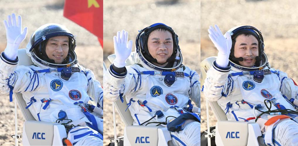 4月30日,神舟十七号航天员汤洪波(中)、唐胜杰(右)、江新林安全顺利出舱。(拼版照片)