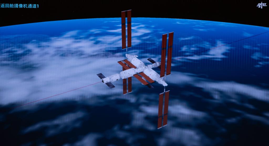 2024年1月18日在北京航天飞行控制中心拍摄的天舟七号货运飞船向空间站组合体靠拢的画面。