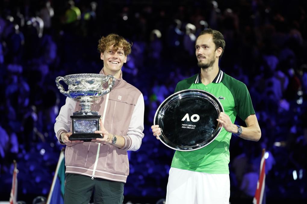 1月28日,在墨尔本进行的2024年澳大利亚网球公开赛男单决赛中,意大利选手辛纳3:2战胜俄罗斯选手梅德韦杰夫,获得冠军。新华社记者 王申 摄