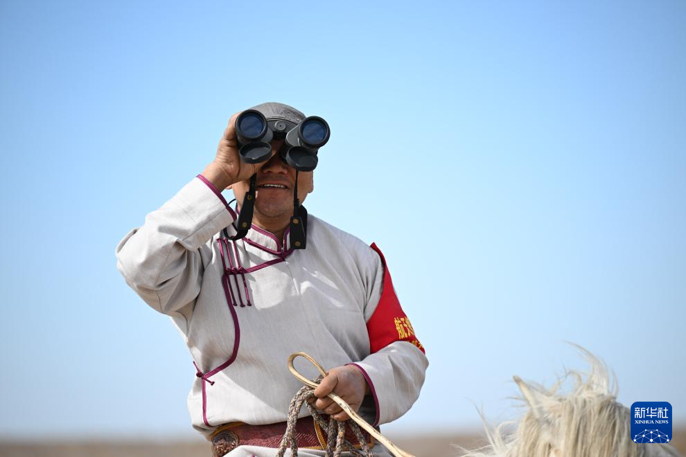 4月29日,卫其勒格其在牧场骑马踏查。新华社记者 连振 摄