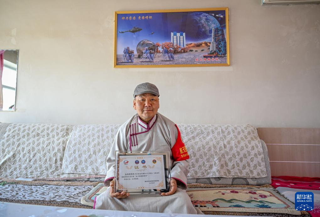 4月29日,卫其勒格其向记者展示他被选为神舟十七号载人飞船返回搜救回收任务名誉“航天搜救联络员”的证书。新华社记者 连振 摄