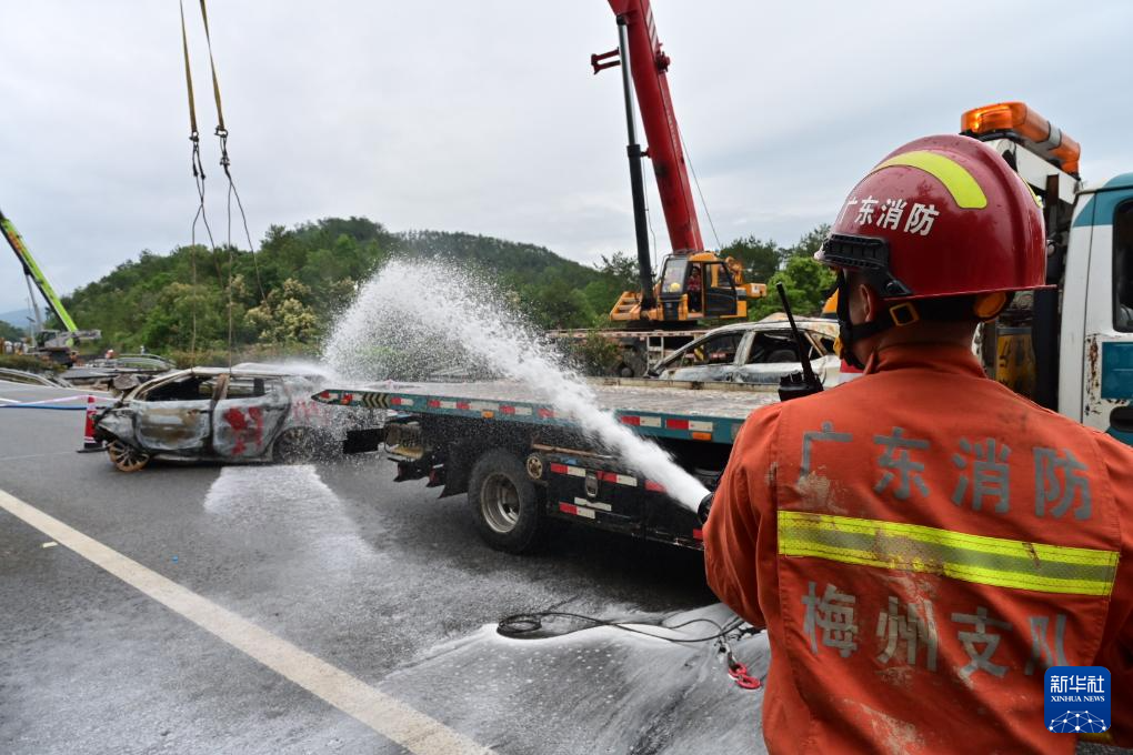 5月1日,消防人员在事故现场对车辆进行处置。新华社发
