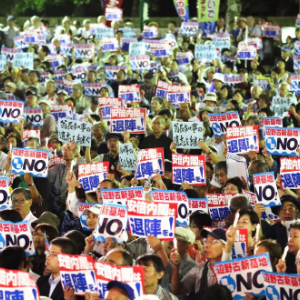 2018年9月19日,在日本东京,民众手持标语参加反对新安保法集会。新华社记者杜潇逸摄