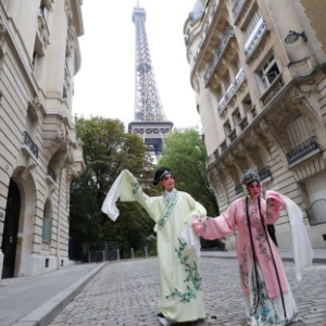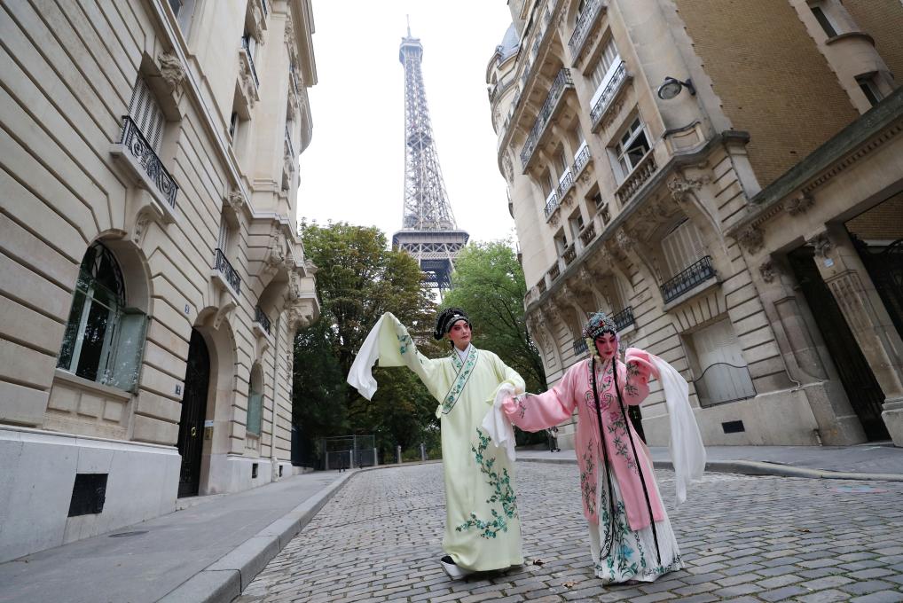 2023年9月13日,中国昆曲演员在巴黎埃菲尔铁塔附近参加昆曲快闪。新华社记者 高静 摄
