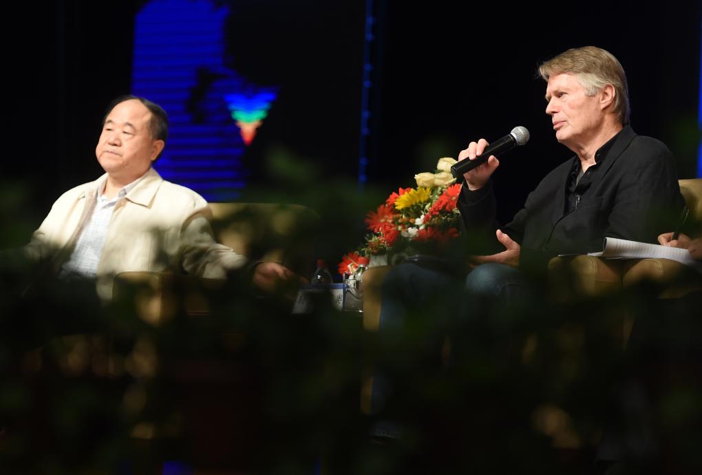 2016年5月24日,莫言与诺贝尔文学奖得主、法国作家勒·克莱齐奥在浙江大学120周年校庆“学术大师大讲堂”活动上对谈。新华社记者 韩传号 摄
