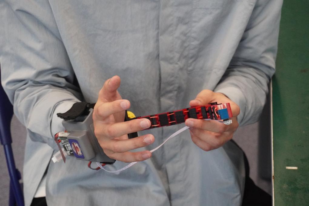 天津大学神经工程团队成员王壮正在展示“神工-灵犀指”。新华社发(隋福毅摄)