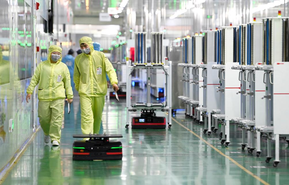 3月21日,在西安航天基地的隆基绿能电池工厂里,工作人员在车间生产线上工作。新华社记者邹竞一 摄