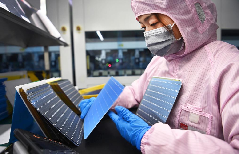 3月21日,在西安航天基地的隆基绿能电池工厂里,工作人员在检查电池片。新华社记者邹竞一 摄