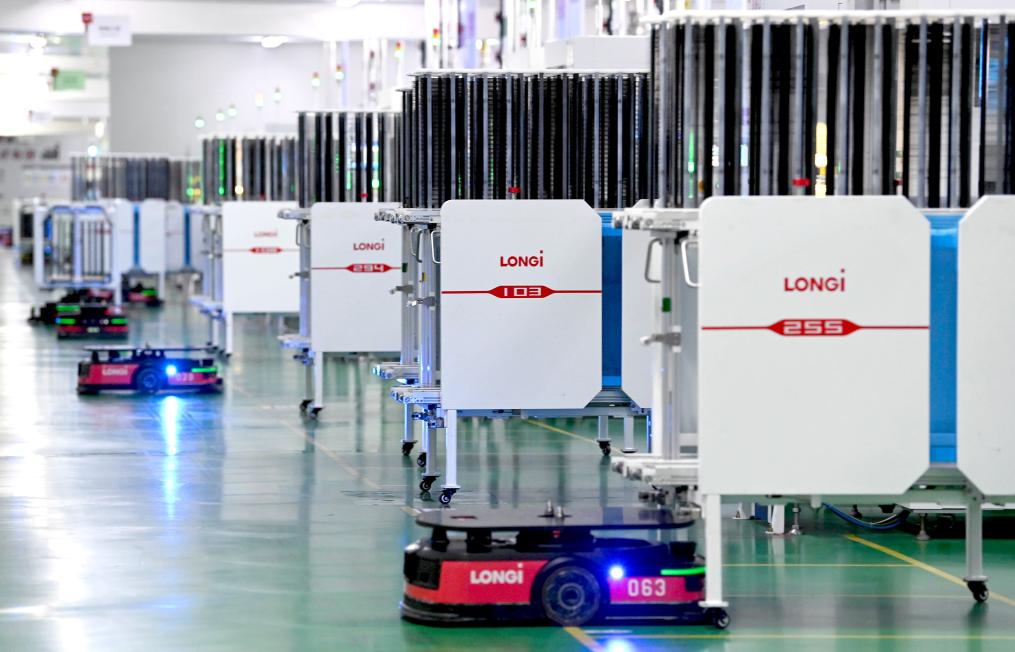 走进陕西省西咸新区泾河新城的隆基绿能29GW单晶电池制造工厂,一个智能化车间跃然于眼前:地面上数十个智能搬运机器人往来穿梭,物流传输带有序运转,机械臂精准高效作业……在这里,平均0.8秒就有一片太阳能电池下线。