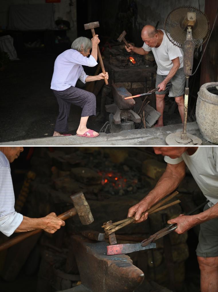 在广西柳州市柳江区三都镇,83岁的韦初元(右)和80岁的老伴韦秀依在制作农具(4月16日摄)。韦初元经营铁匠铺已经有60年,如今他和老伴依旧坚持为周边村民制作农具。