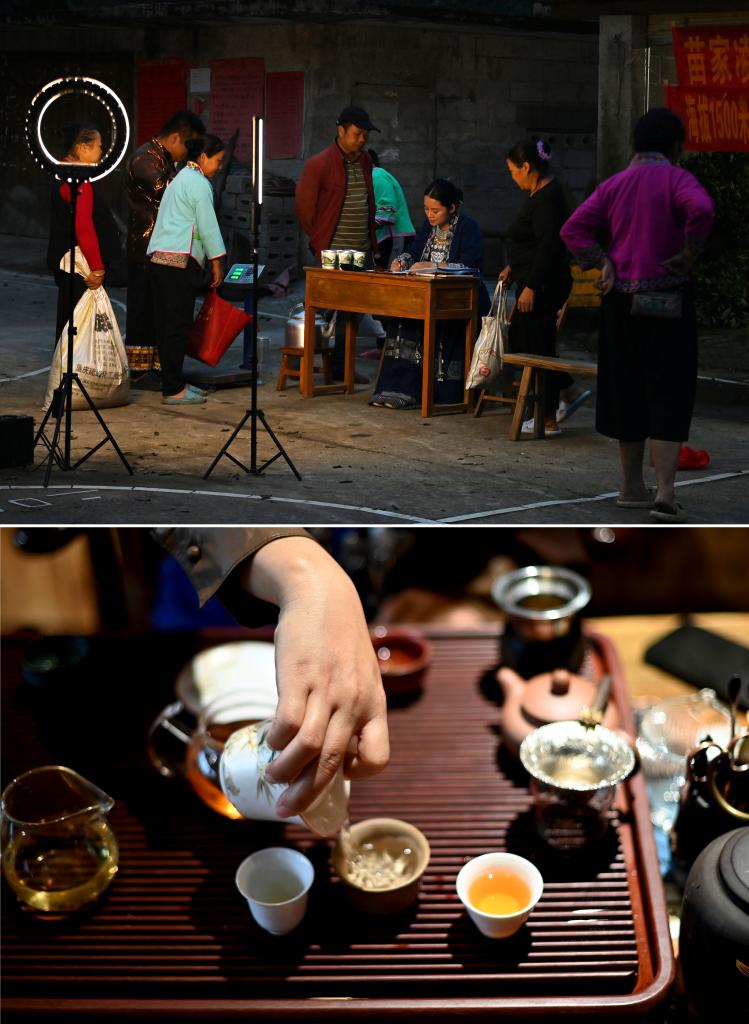 上图:在广西柳州市融水苗族自治县香粉乡中坪村,苗族姑娘贾宥凌(右三)在收茶叶;下图:贾宥凌在泡茶(4月20日摄)。2019年,贾宥凌返乡创业,借助直播和短视频销售大苗山的农副产品。