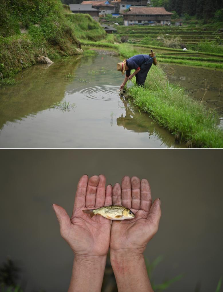 在广西柳州市融水苗族自治县杆洞乡党鸠村,67岁的吴庆辉在稻田里放鱼苗(4月11日摄)。在稻田里养殖禾花鱼是当地的传统,可以提高稻田利用率,增加收入。
