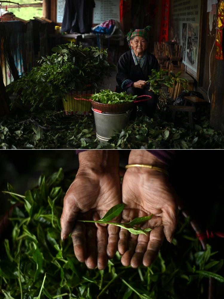 在广西柳州市融水苗族自治县杆洞乡党鸠村,72岁的梁妹花老人在整理刚刚采摘的茶叶(4月11日摄)。油茶是当地的传统饮品,梁妹花每天都要打油茶。