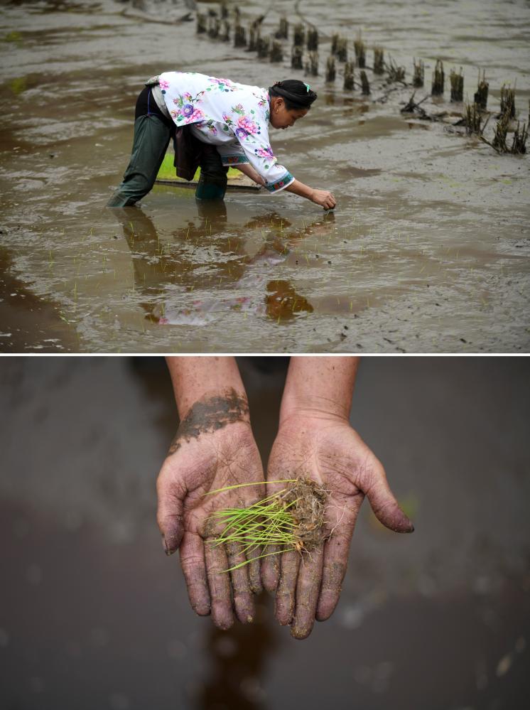 在广西柳州市融水苗族自治县杆洞乡党鸠村,51岁的村民韦妹丽在插秧(4月11日摄)。韦妹丽家的两亩多田,养育她一家5口。
