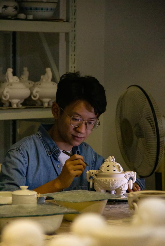 苏泓亦生于2003年,在他儿时的记忆中,自己经常坐在爷爷苏清河膝上玩着瓷泥。“爷爷是德化瓷烧制技艺国家级非遗传承人,爷爷把手艺传给了父亲,父亲又传给我。”苏泓亦说。
