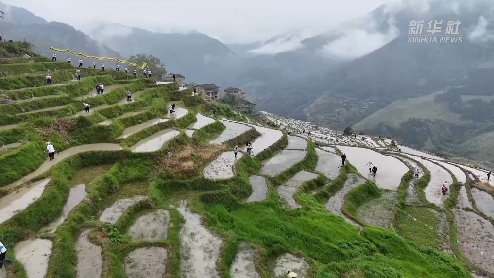 5月2日,广西桂林市龙胜各族自治县龙脊古壮寨举行一年一度的“开耕节”,当地村民在梯田上开展耦耕、牛耕、挖田、砍田基、扶田基、除草等传统农事活动,展现了一幅美丽的立体农耕图景,活动吸引众多国内外游客前来旅游体验。