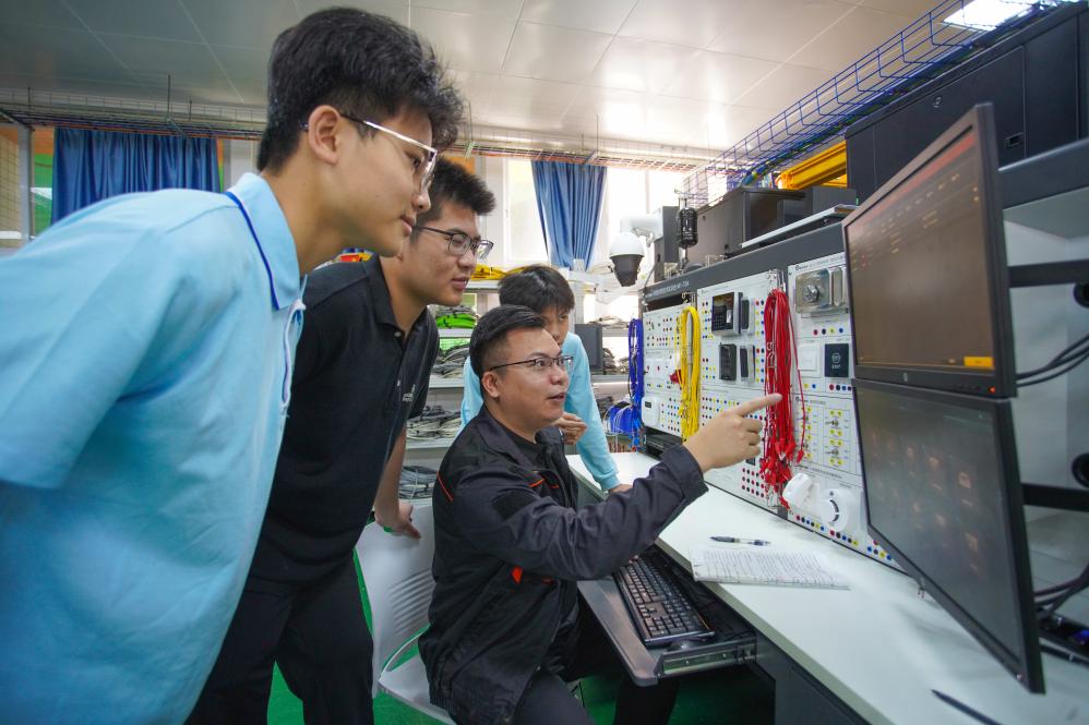 梁嘉伟(前排右一坐者)正在向学生传授技术课程。新华社记者胡拿云 摄