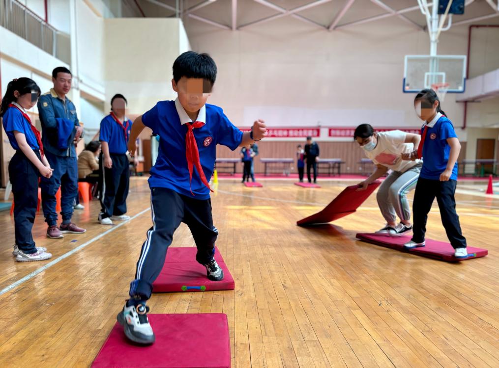 “预备,开始!”一间体育馆里,哨响清脆,两名小学生并排开启“青蛙过河”比赛,他们揪起各自身旁的红色棉垫,铺在身前供双脚站立,回身摸索到另一块儿棉垫再拎至前方,如此往复,朝终点进发。