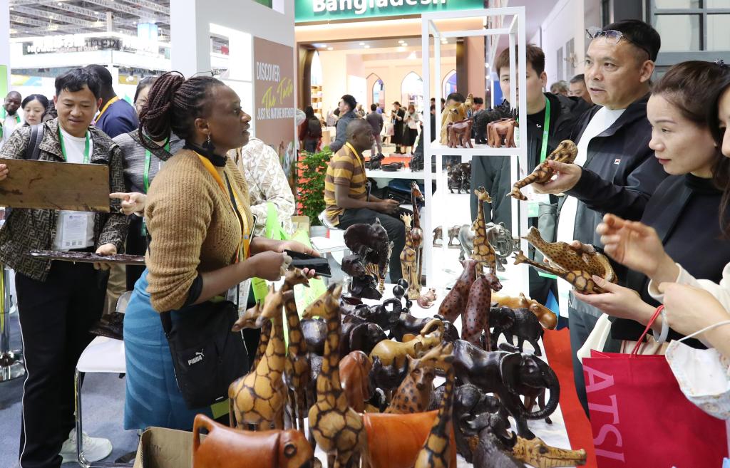 2023年11月6日,来自津巴布韦的艾薇顿丝·察卡瓦在展台向参观者介绍木雕展品。这是她第一次来到中国上海参加进博会,这些木雕都是她的哥哥在家里制作的,她想通过进博会为哥哥的木雕作品找到好的销路。新华社记者方喆摄