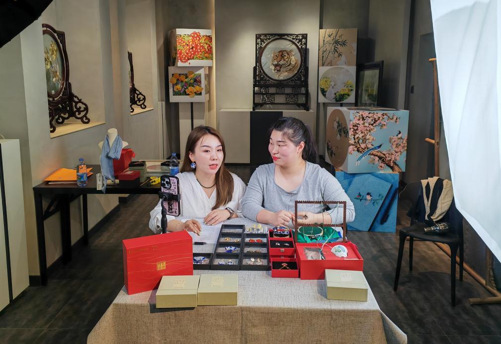 湖南省湘绣研究所的青年员工在直播间介绍湘绣产品。新华社记者白田田 摄