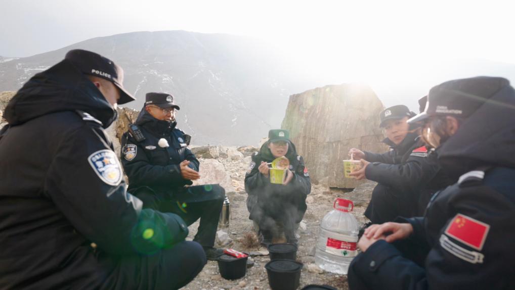 经过4个多小时的高海拔行走,巡边队伍终于到达了6000米的巡逻折返点位,也到了巡逻路上的快乐时刻,吃火锅!“现在后勤保障到位,无论在野外何处,吃顿热饭已不是难事”,带队的副所长次仁加措说道。