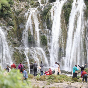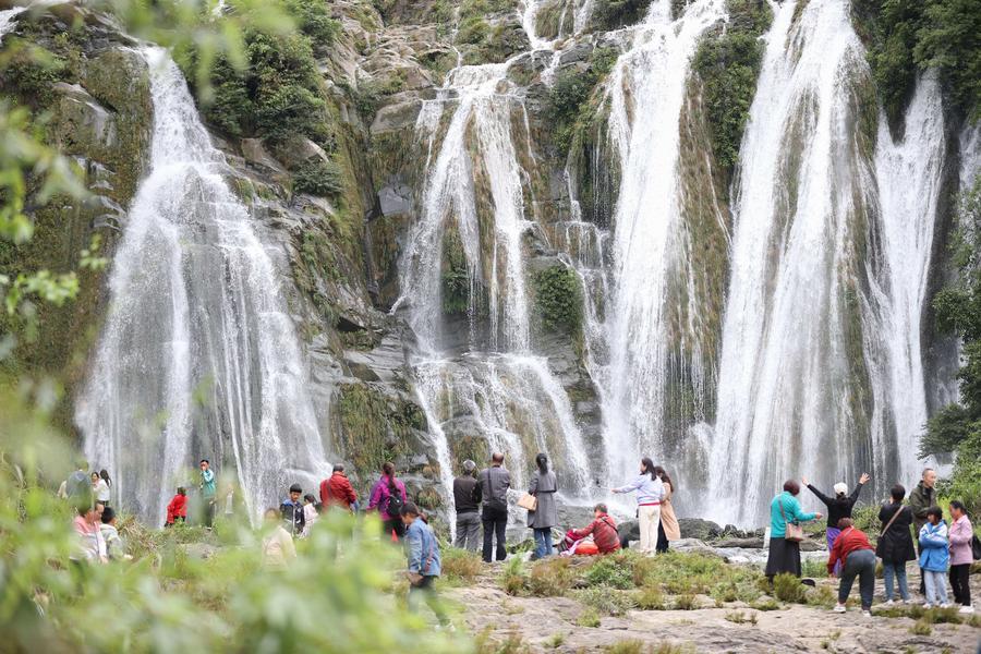 5月1日,游客在贵州省丹寨县龙泉镇排廷村瀑布观赏游玩。新华社发(杨武魁摄)