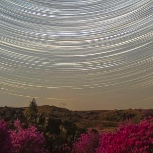 在黑龙江省牡丹江市宁安市拍摄的杜鹃花和星轨(5月1日摄,堆栈合成照片)。新华社发(王宝勋 摄)
