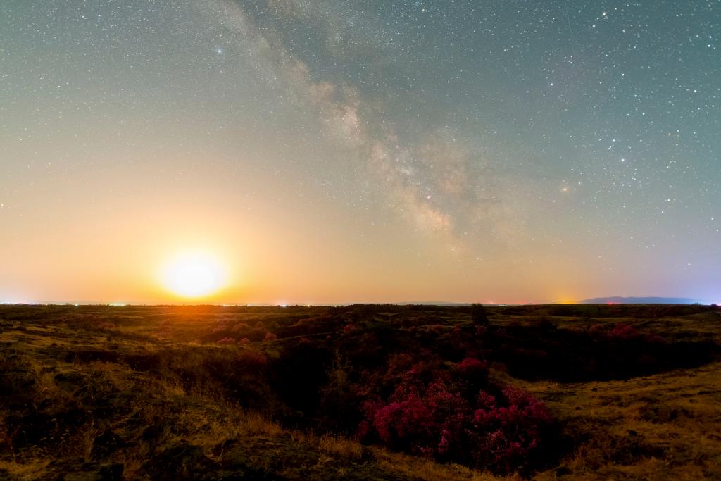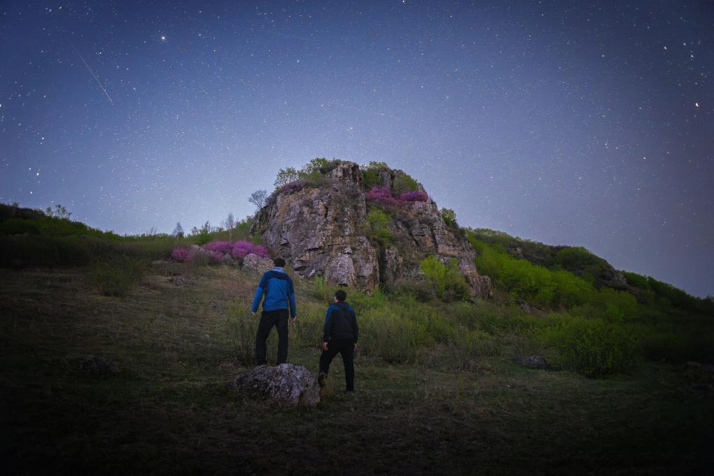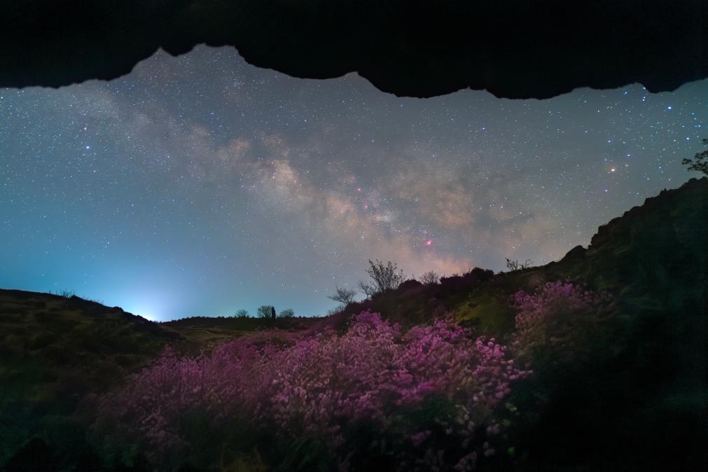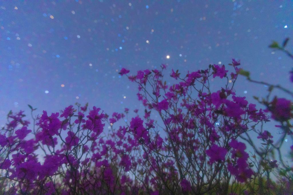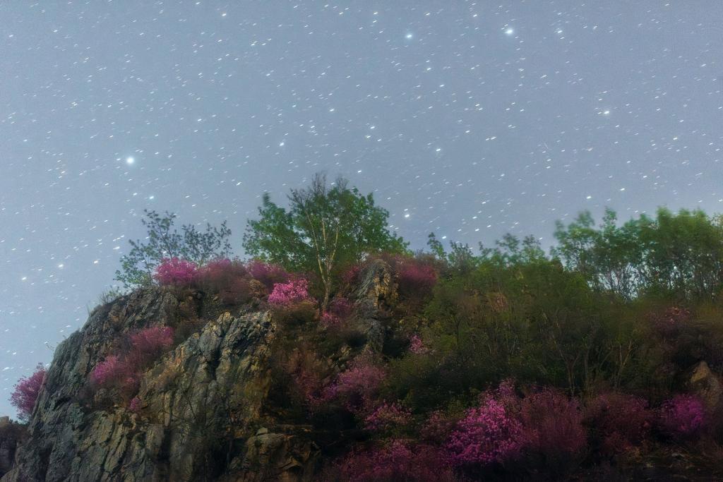 在黑龙江省牡丹江市宁安市拍摄的杜鹃花海和夜空(5月2日摄)。新华社发(王宝勋 摄)