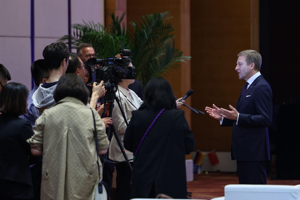 2024年4月26日,辽宁省沈阳市与宝马集团深化战略合作签约仪式在沈阳举行,这是宝马集团董事长齐普策接受采访。新华社记者 潘昱龙 摄