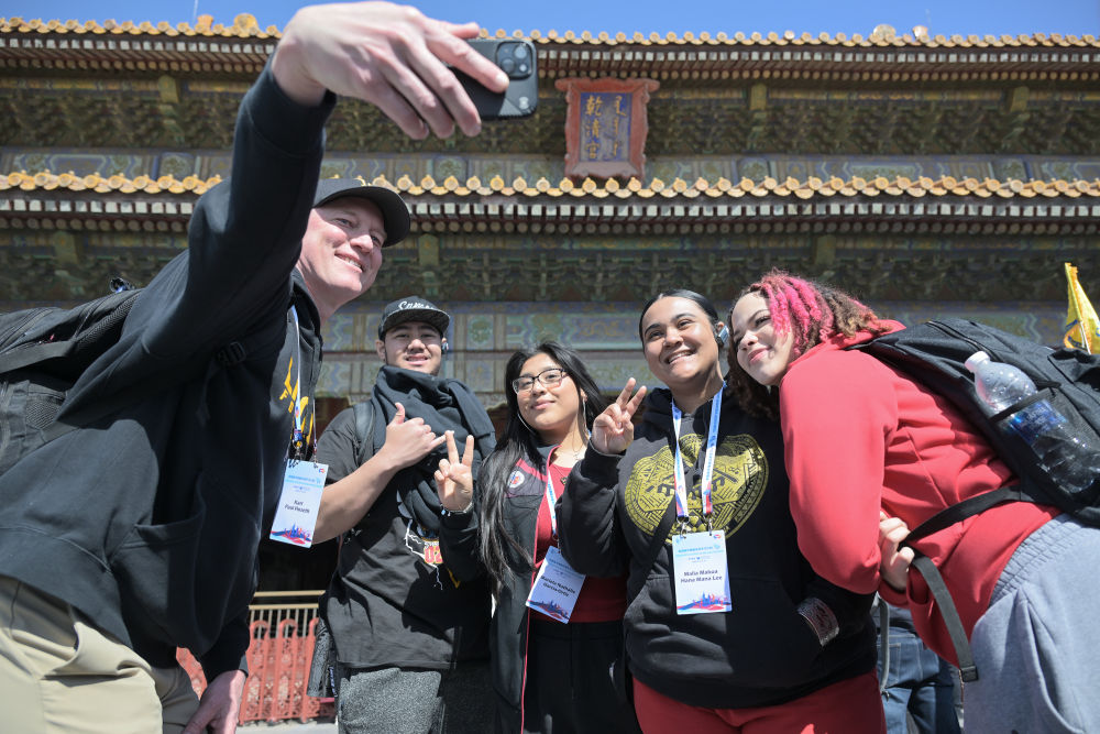2024年3月19日,美国华盛顿州中学生代表团的成员在故宫乾清宫前合影留念。新华社记者 李鑫 摄