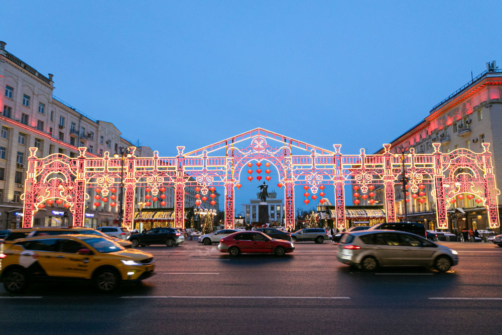 2024年2月9日,在俄罗斯首都莫斯科,车辆在中国新年主题装饰前驶过。当日,“莫斯科的中国新年”文化活动在俄罗斯首都莫斯科市中心启动。新华社记者 白雪骐 摄