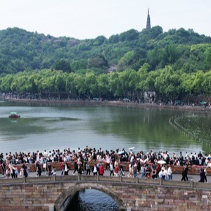 5月1日,杭州西湖断桥上人流如织(无人机照片)。新华社发
