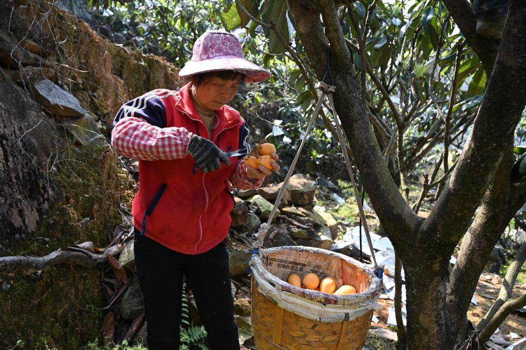 一名果农在莆田市城厢区常太镇松峰村采摘枇杷。(陈颖 摄)
