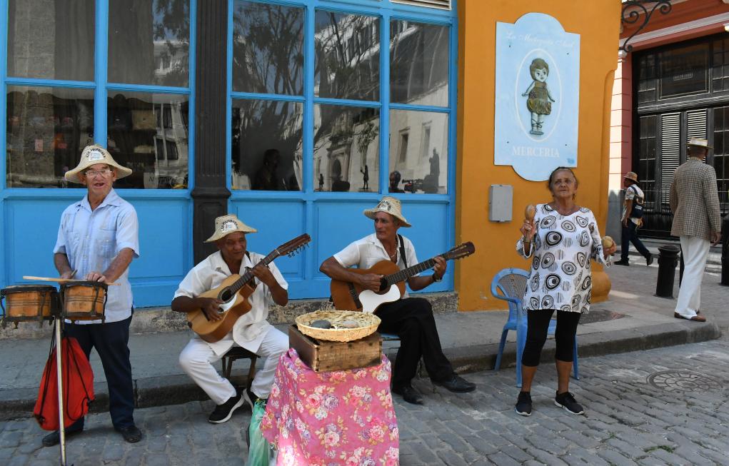 2023年5月4日,艺人在古巴哈瓦那旧城一角表演。新华社记者林朝晖摄