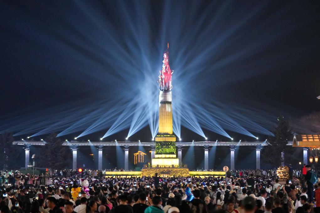 5月3日,人们在哈尔滨防洪纪念塔广场观赏光影秀。新华社记者 王建威 摄