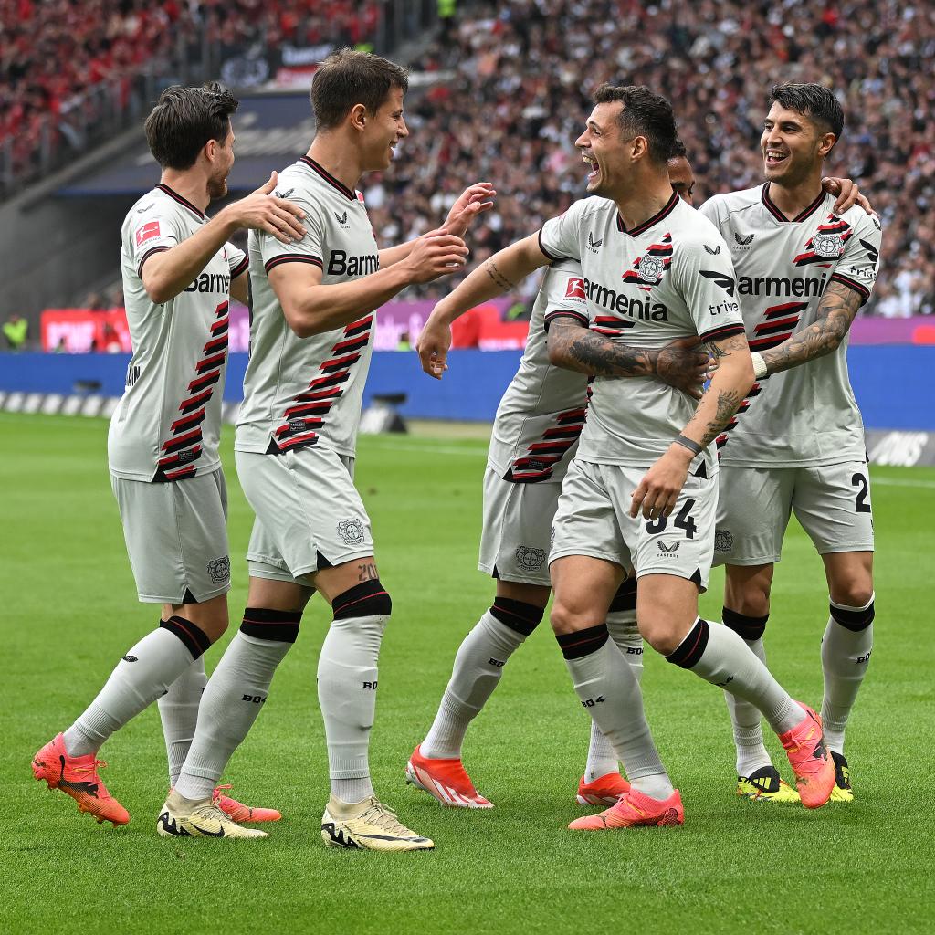 5月5日,勒沃库森队球员扎卡(右二)进球后与队友庆祝。新华社发(乌尔里希·胡夫纳格尔摄)