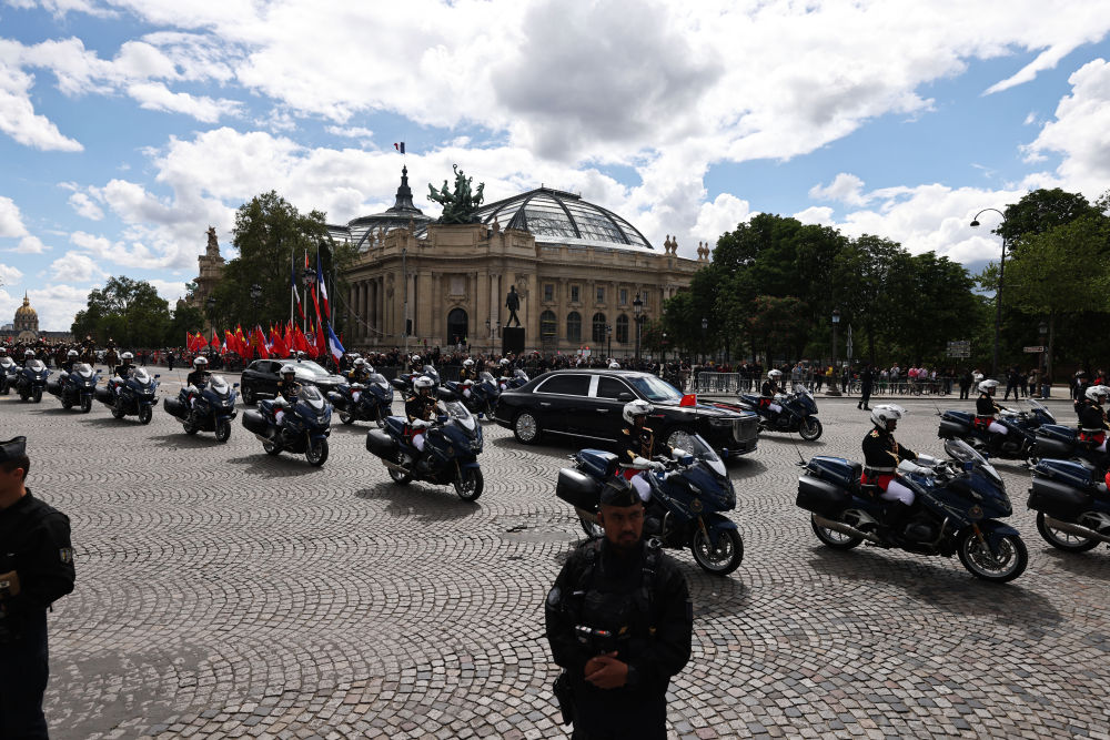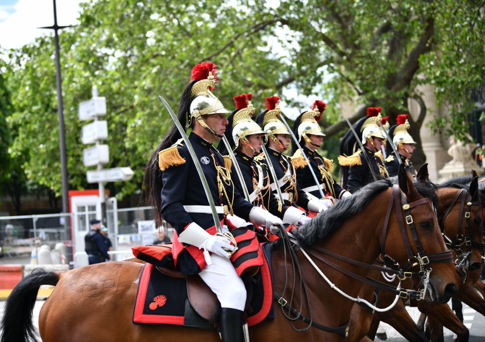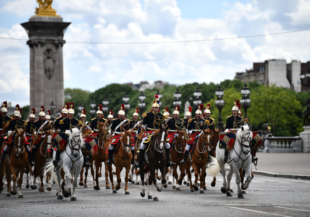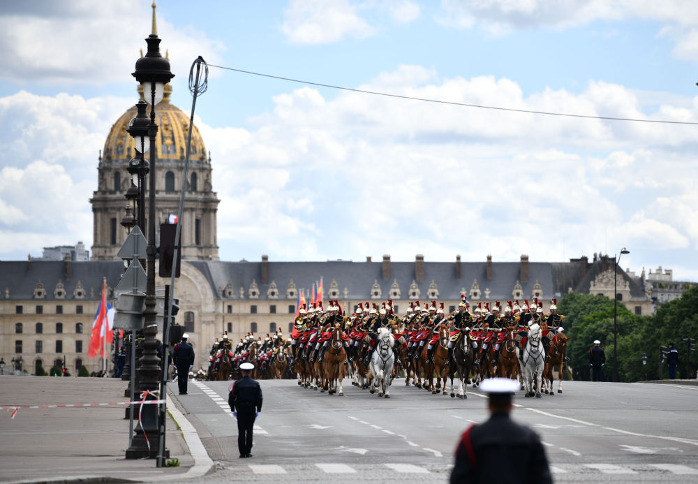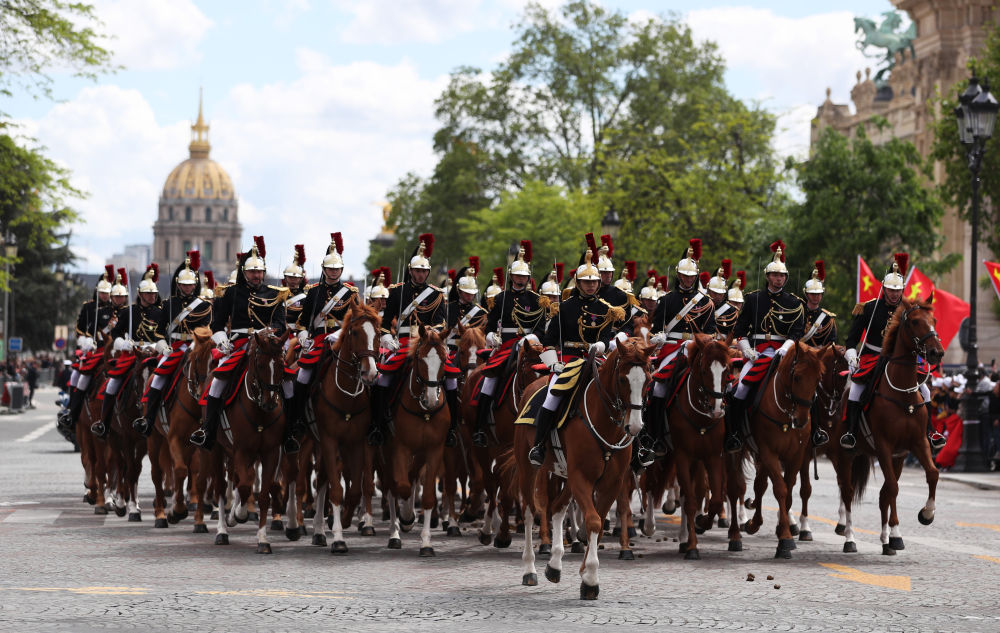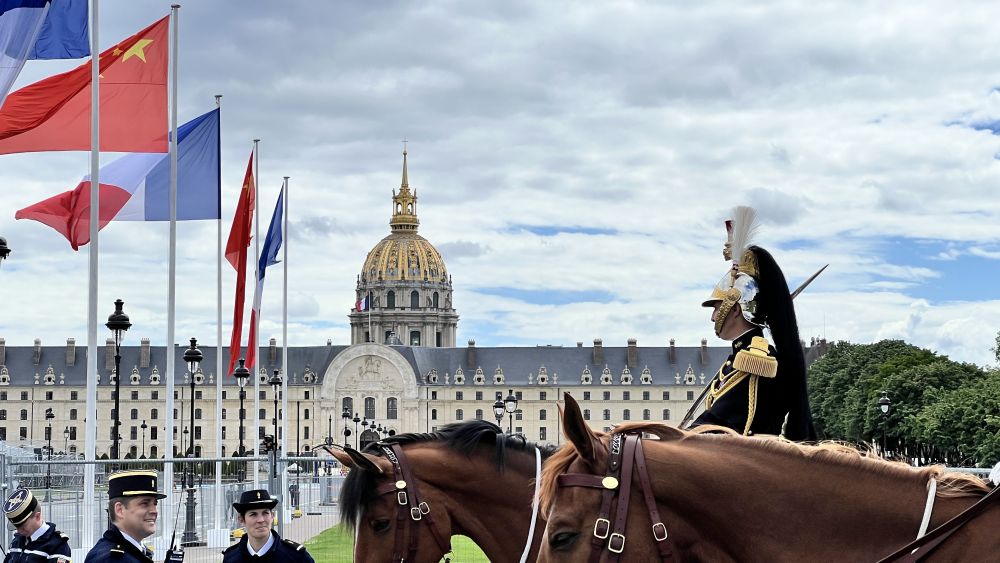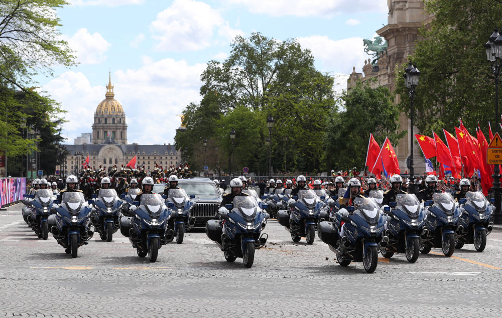 当地时间6日下午,法国总统马克龙在巴黎荣军院广场举行隆重仪式,欢迎中国国家主席习近平。欢迎仪式后,习近平主席和夫人彭丽媛在骑兵组成的礼兵马队和摩托车队护卫下,乘车前往爱丽舍宫。